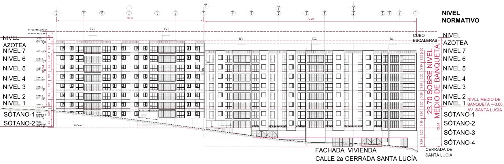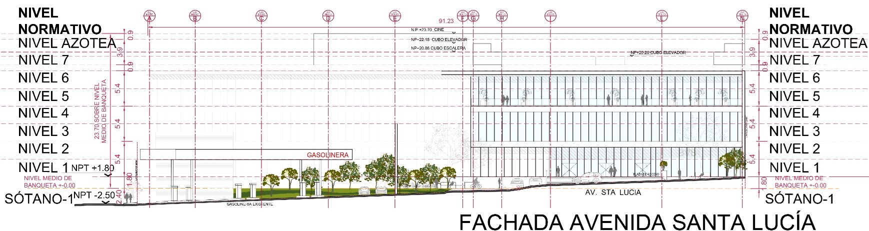 Debido a que el predio en el que se desarrollará el proyecto “Santa Lucía 810: Zitaria” presenta una pendiente descendente de poniente a oriente sobre Av. Santa Lucía, el acceso a la Plaza Comercial Local de Servicios se determinó el nivel medio de banqueta N.P.T.± 0.00, el desplante de la gasolinera existente se considera en el nivel de Sótano 1 N.P.T. -2.50